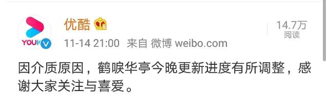 对此播出平台方也曾经给出过解释称因为介质原因,《鹤唳华亭》更新进度有所调整,当时这部剧才刚刚更新完前2集。