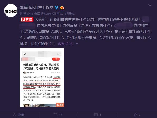 11月22日下午,郝蕾工作室官方微博“郝蕾山水回声工作室”发布一条微博,将某自媒体挂了出来。