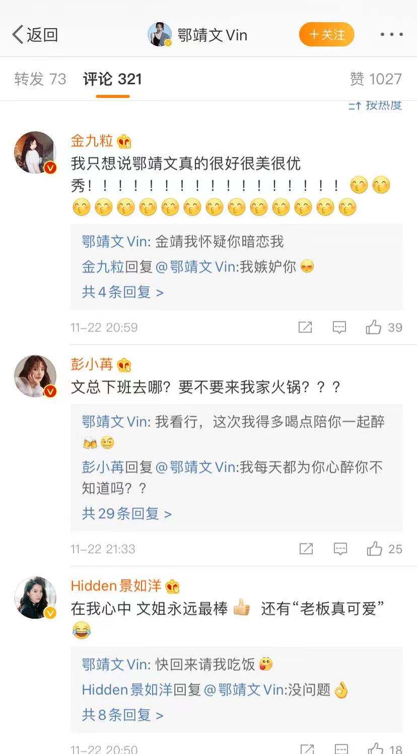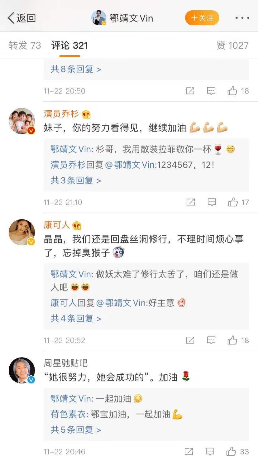 彭小苒和金靖都发文安慰鄂靖文,其实鄂靖文看起来很开心,并没有心生怨言,毕竟是自己选择的,失败了也是无怨无悔,成年人做出选择就不要后悔,从哪跌倒就从哪爬起。
