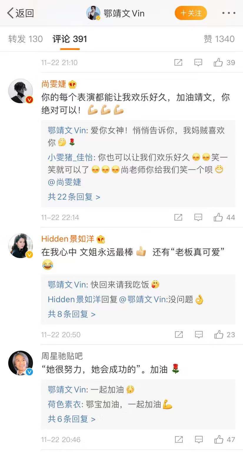 周星驰贴吧发文,可能用了周老板的原话“她很努力,她会成功的”安慰鄂靖文,还有康可人和乔杉也发文安慰鄂靖文,心态都很好,并没有说不好半个字。经历了很多平平淡淡的时光,相信鄂靖文总有一天会大火。