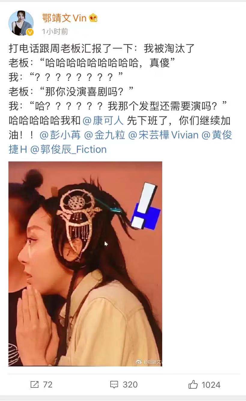 鄂靖文发微博,声称打电话给周老板,应该就是周星驰,说自己淘汰了,老板说她真傻,问她是不是没有演喜剧,她说自己的发型还需要演吗?鄂靖文晒出自己的带妆照,其实看起来很有喜感,不演就很搞笑,但真实影像化中并不是很搞笑,相反很苦情。没有透露更多和周老板的聊天内容,应该会安慰她,不知道鄂靖文是不是签约了周星驰的公司,从周星驰的一些官网安慰鄂靖文来看,应该是签约了。