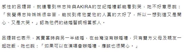 据台湾媒体透露,吕婕菲昨日举办发片记者会,在被记者采访问道林志玲与AKIRA的世纪婚礼看到哭,她不好意思说:“我觉得志玲姐姐很辛苦,能找到疼他爱他的人真的太好了,所以一想到这又是开心、又是大哭。”还表示他们的结婚誓词很是感人,让人不禁就跟着眼含热泪。
