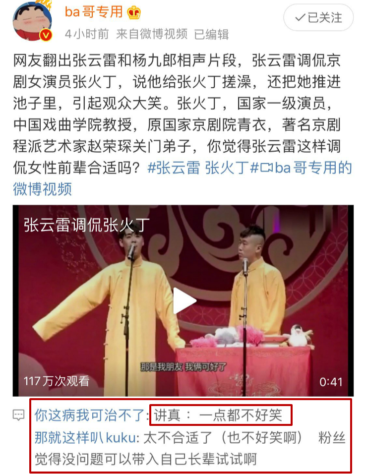 在张云雷粉丝看来,张云雷这样调侃张火丁老师是合情合理的。