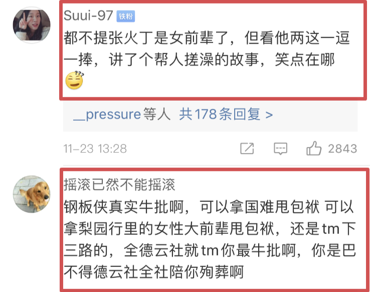 还有网友质疑张云雷:钢板侠真实牛批啊,可以拿国难甩包袱,可以拿梨园行里的女性大背甩包袱,还tm下三路。全德云社就tm你最牛批啊!你是巴不得德云社全社陪你殉葬啊!