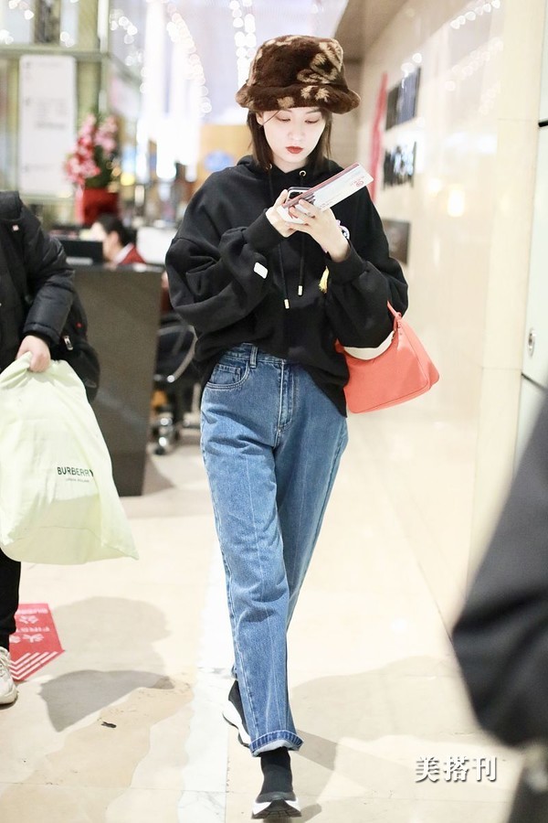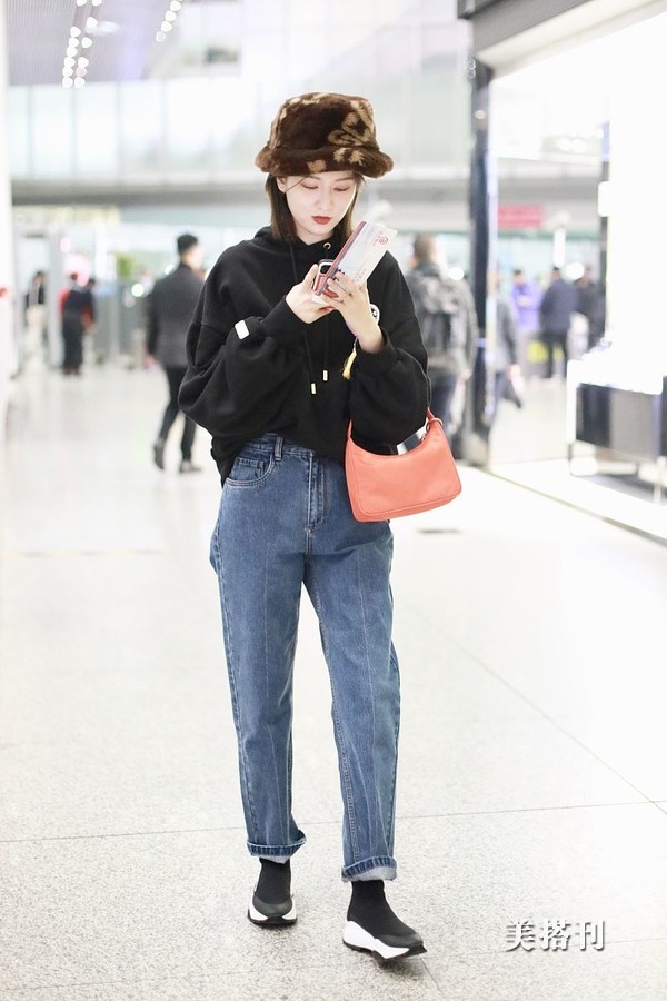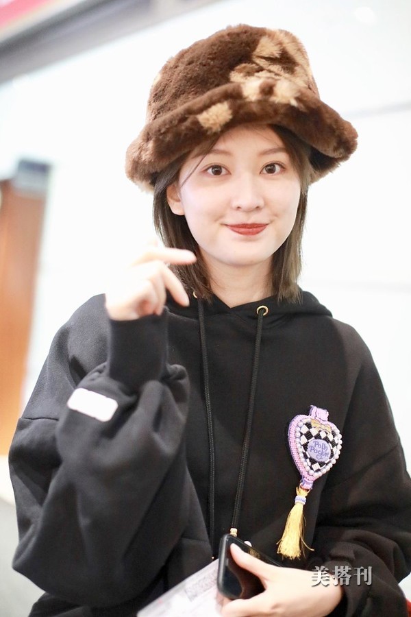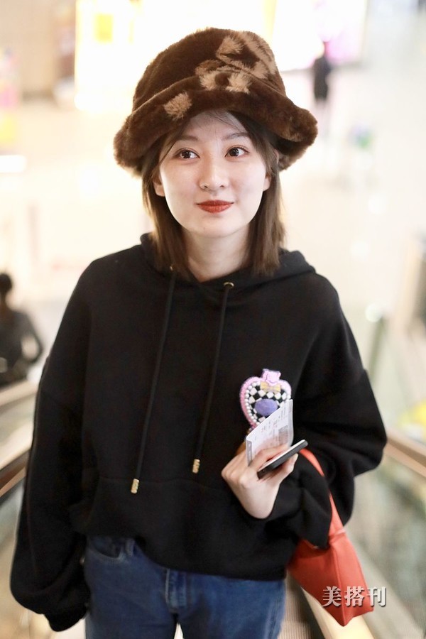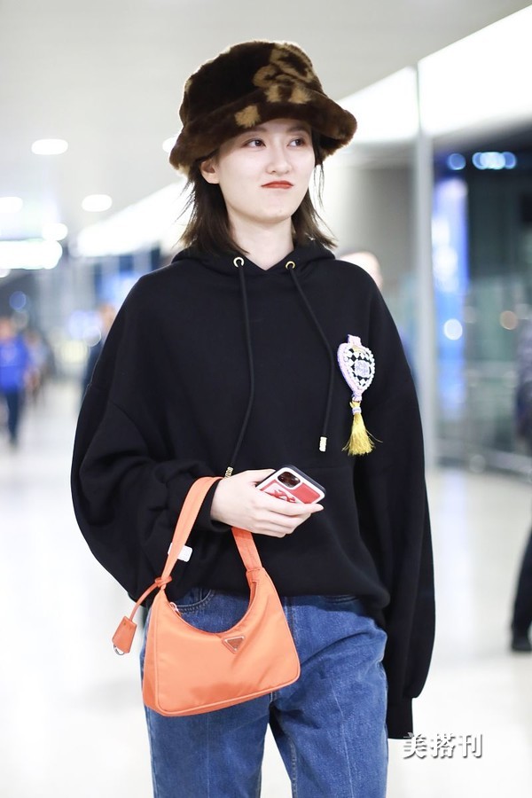 原标题:甜心小可爱!乔欣戴毛绒渔夫帽现身机场,挎橙色饺子包萌度