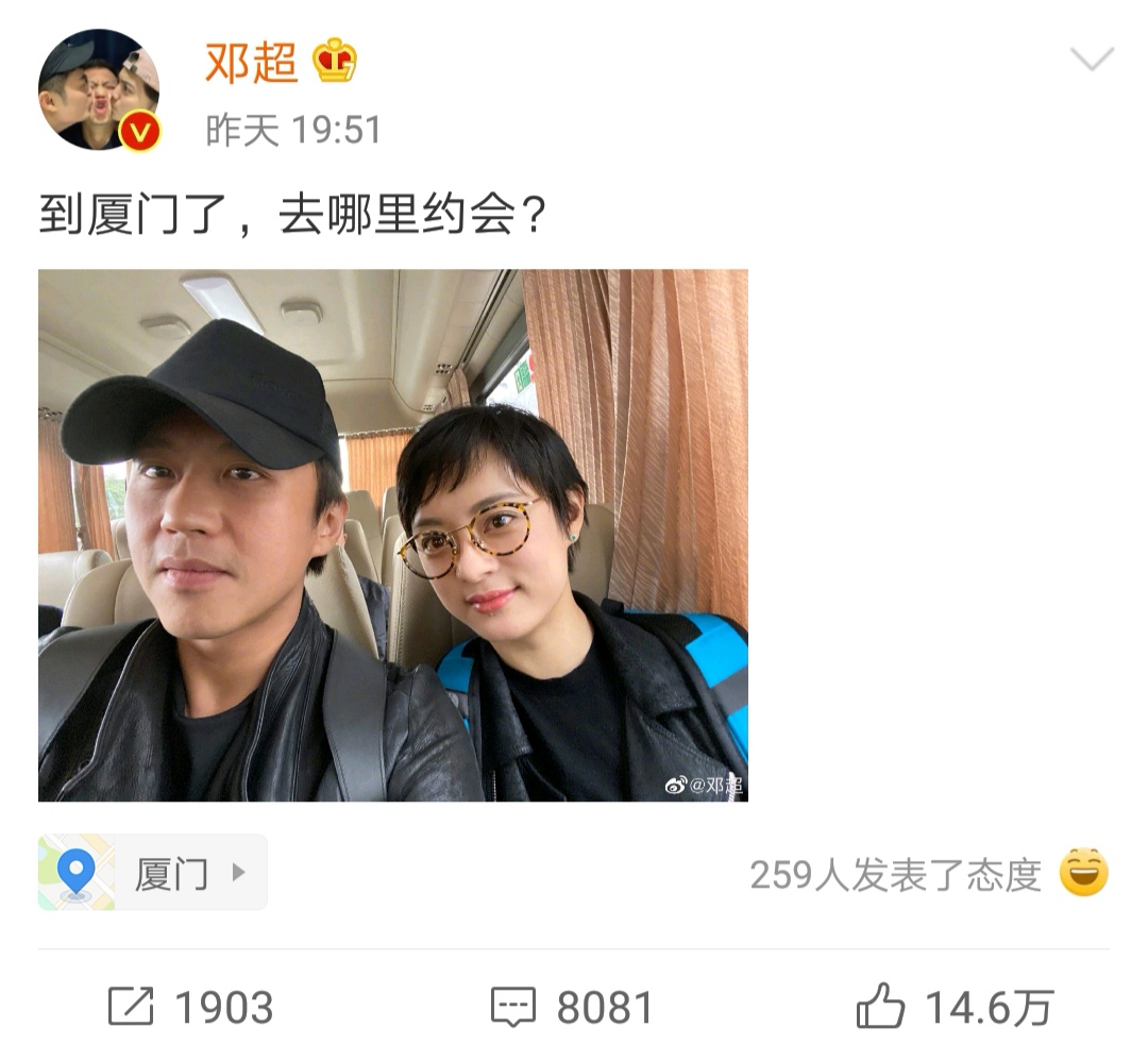 而就在傍晚,邓超还在社交平台上晒出一张与孙俪在车上的合照,并附文询问网友:“到厦门了,去哪里约会呢?”两人这恩爱可是不要太秀呢!结婚9年的邓超孙俪虽然是越来越有夫妻相,不过孙俪明显状态要比邓超好很多呢,夫妻二人合照中,一向宠妻的邓超也是让孙俪坐在了靠窗边的位置。照片中戴着花边镜框,涂着红唇的孙俪,气色红润,皮肤状态也是很好,背着双肩包坐在车上的她看起来就像是学生一般。看到这里又让大家对幸福爱情有了满满的向往了,也想有个相互依赖又相互逗趣的伴呢!