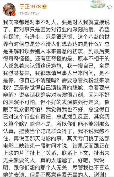 或许是嫌事情闹得不够大,于正在23日又发文说自己对事不对人,否认女演员是马思纯。但没想到最后他居然又吐槽说马思纯演技本来就不行。