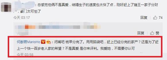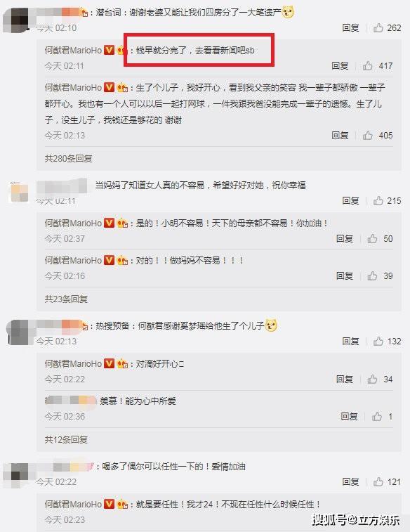 从另一条何猷君的回复可知,奚梦瑶能为赌王家带来长孙,这本就是何鸿燊这位百岁老人的愿望。何鸿燊虽然有四位妻子,但第三代人无一男丁,而正是何猷君与奚梦瑶为何家的正统血脉带来了第一缕希望。何猷君的开心是开心在这里,并不是所谓的家产之争。
