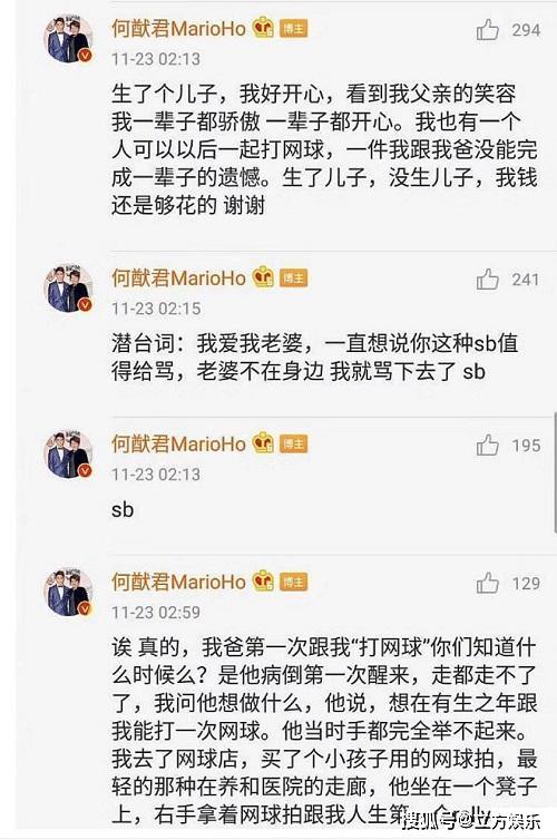 在澄清了诸多事情之余,这种护妻护爹又护子的行为确实还有让人有好感的,只可惜,何猷君只有在喝多的时候才能这么刚。希望何猷君有时间可以多跟网友交流,这样也省得大家费劲去猜了。