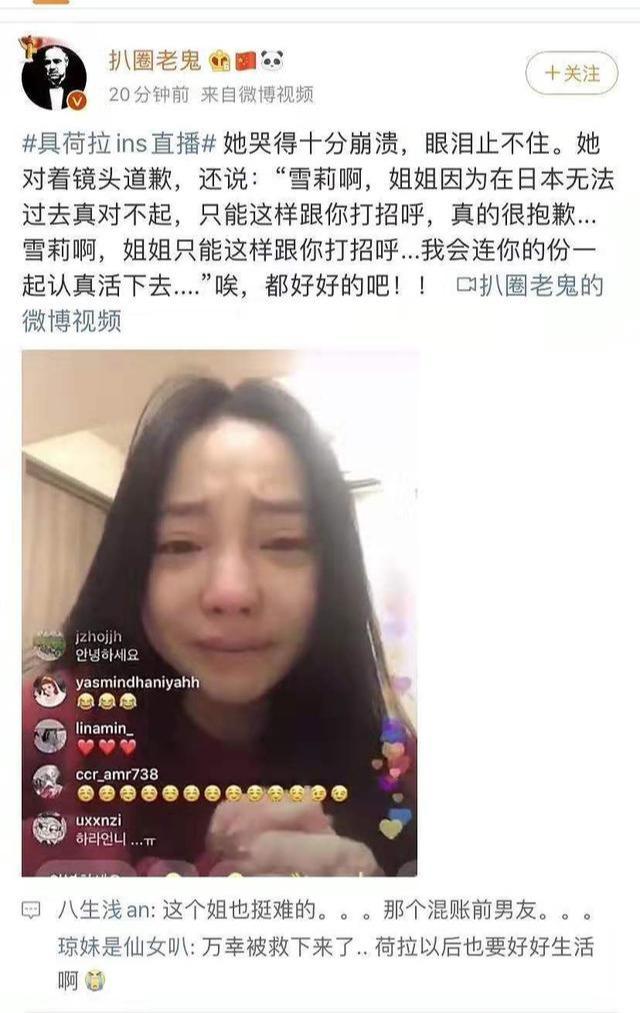 可伤感是掩藏不住的,在直播过程中,具荷拉几次崩溃大哭,对崔雪莉道歉,说对不起她,不能去看她了。