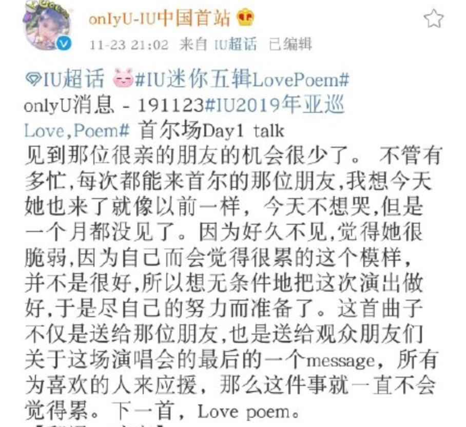 最近,iu首尔场的演唱会在23号顺利进行。在最后的“安安可”环节,IU深情的说到:我最亲爱的朋友再也没办法来看我的演唱会了,以前每次首尔场她都会来。今天我不想哭,她看到我脆弱和辛苦的样子,应该会很难过。