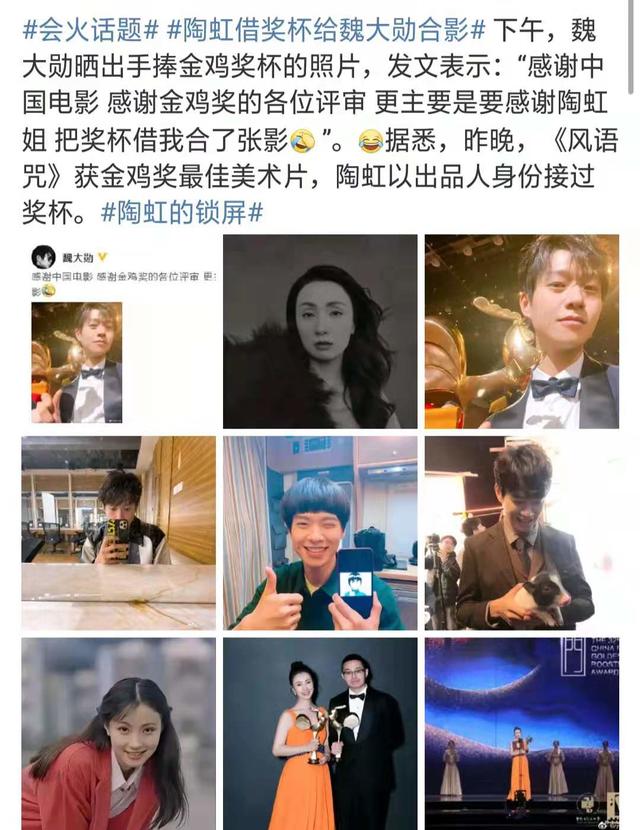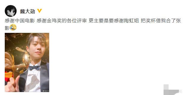 在魏大勋的社交平台上,一连长串都是表达自己的感激之情,先是感谢中国电影,魏大勋和彭昱畅,王大陆三人的电影作品《小小的愿望》给大家带来了欢笑和泪水。随后就是感谢金鸡奖的各位评委,有了前面的铺垫,随后才是魏大勋这条动态想要说的重头戏,感谢陶虹姐,把奖杯借给自己合影。