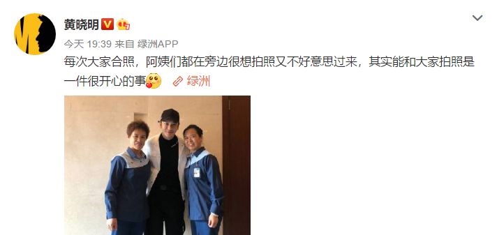 原标题:黄晓明好温柔,主动和打扫卫生阿姨合影,称能和大家拍照很
