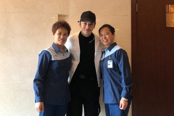 11月24日,黄晓明晒出一张和扫地阿姨的合影,配文“每次大家合照,阿姨们都在旁边很想拍照又不好意思过来,其实能和大家拍照是一件很开心的事情。”