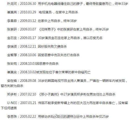 韩国娱乐圈还有许多在近十四年内自杀的人!小8也只是找出了其中比较震惊,让人难以接受的其中几位,写到现在也实在是于心不忍!这些艺人所遭受的网曝、家暴、抑郁、屈辱都成了杀死他们的真凶!