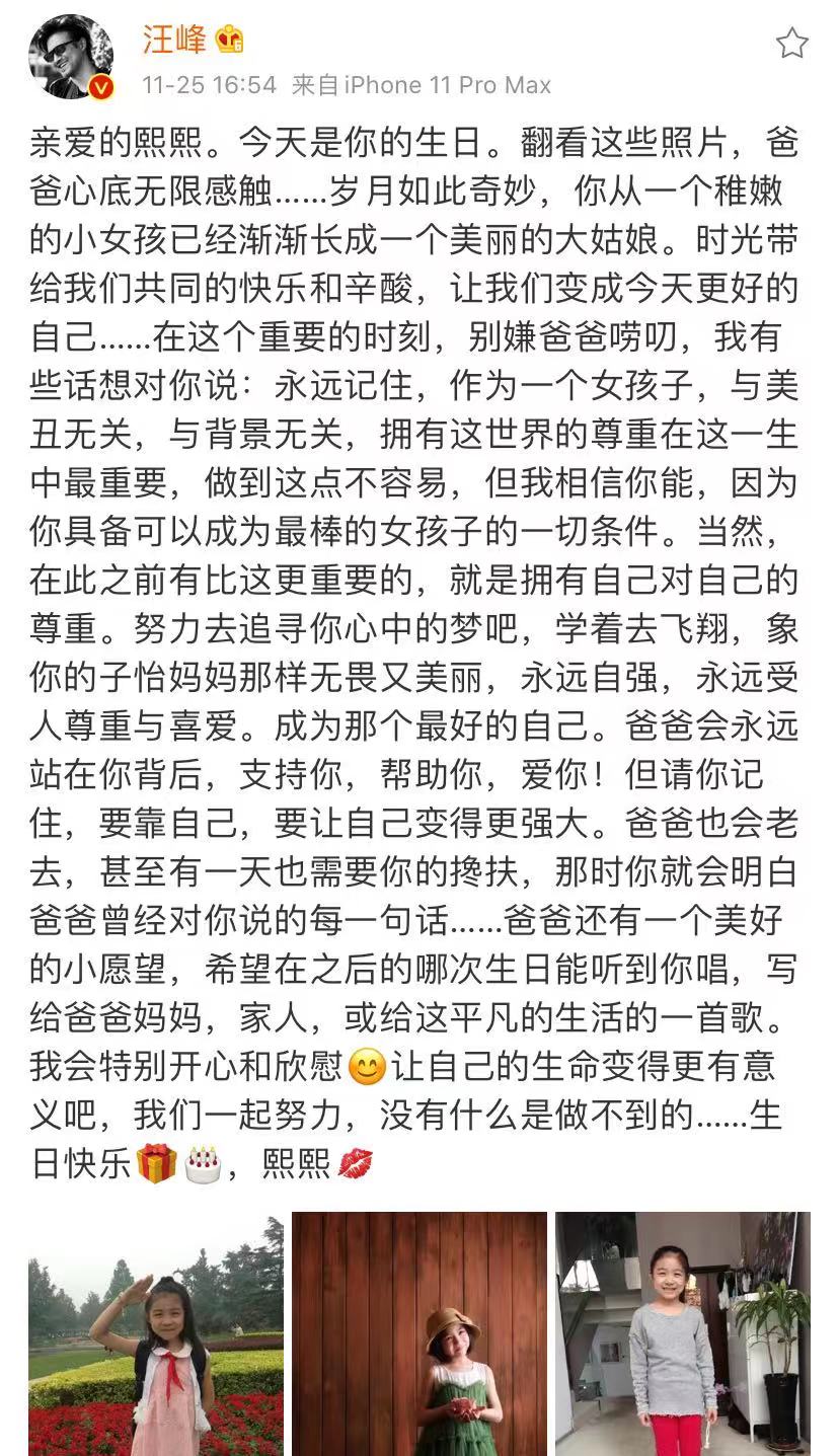 汪峰晒出熙熙小时候到现在的照片,真的是老父亲的肺腑之言,汪峰希望女儿要坚强、勇敢和自信,像子怡妈妈那样无畏又美丽,永远自强,永远受人尊重和喜爱。认为作为一个女孩子美丑和背景都不重要,重要的是获得别人的尊重,拥有别人的尊重很重要,希望女儿努力做到。还鼓励女儿唱出自己写给家人的歌,作为父亲会特别开心和欣慰。网友认为汪峰可以当作家了,因为情感真挚,文笔很不错。