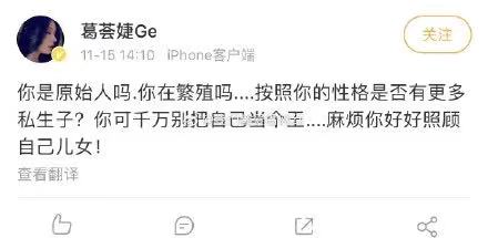 葛荟婕对女儿熙熙没有陪伴也没有照顾,经常发一些很酸的微博,貌似在怼汪峰。好久没有发微博的葛荟婕看到章子怡怀孕的消息又跳出来怒怼汪峰,认为汪峰是原始人,只会不断的繁殖,还挑事说有不少私生子,还说千万别把自己当个王,照顾好自己的女儿。疑似为女儿熙熙抱不平,提醒汪峰要对女儿好。葛荟婕也是很毒舌,一直没有放下对汪峰的恨。不过这条微博后来被删除。