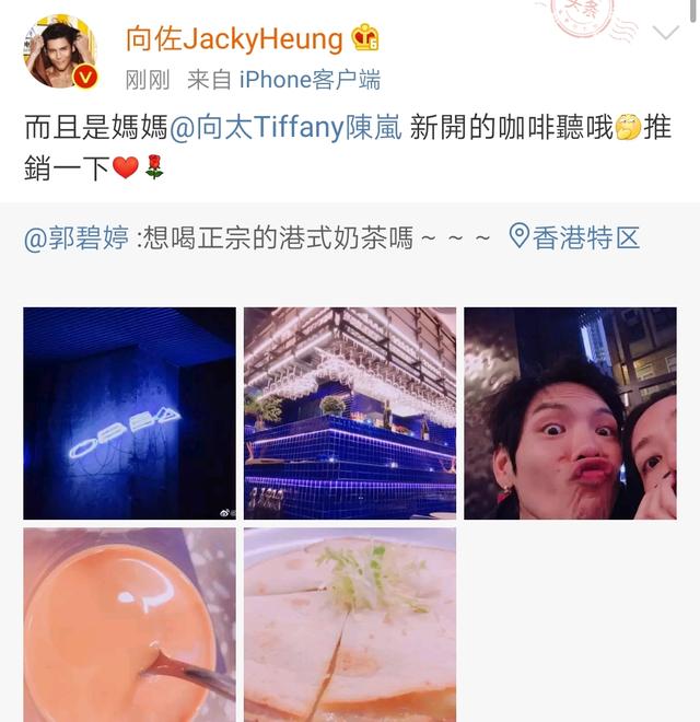 原标题:郭碧婷难得主动晒照,与向佐嘟嘴秀恩爱,帮向太新开咖啡厅做