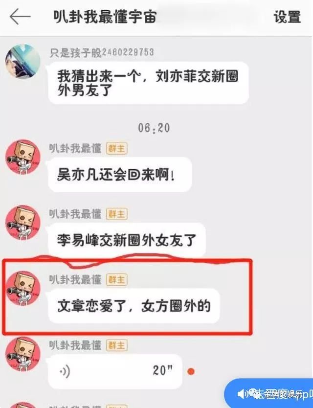 11月24日,一个八卦大号在八卦交流群里称:文章恋爱了,女方是圈外的。据说,这位八卦大号来头并不简单,正是大名鼎鼎的卓伟本人。