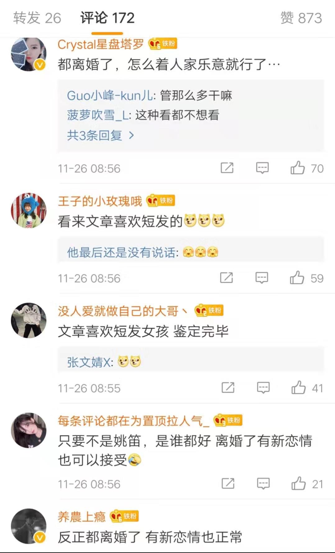 出轨后文章虽然人设崩塌,但是没有谁规定离婚后文章不能寻求新恋情,网友表示“只要不是姚笛就行”。如果此次恋情是真的,还是祝福他吧!