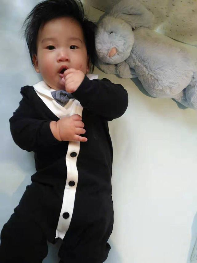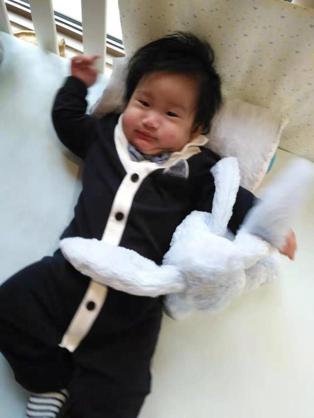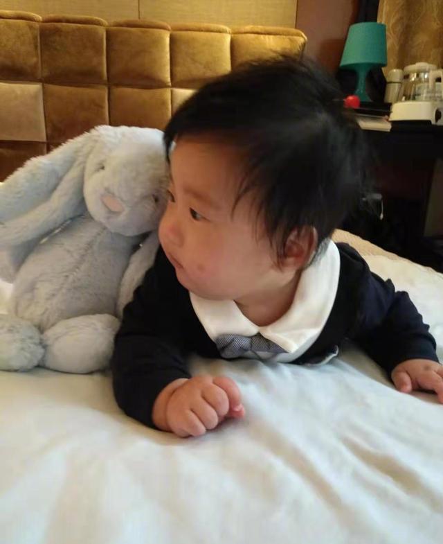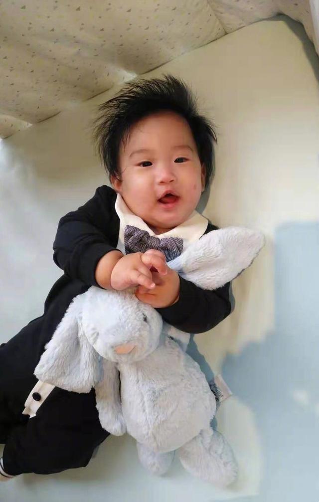 大概是新买了个娃娃,冉莹颖不停地给儿子拍照,小家伙躺在靠垫上,似乎还坐不稳,也没有那么大的力气,所以只能乖乖服从,睁着大眼睛,张着樱桃小嘴一动不动,表情很是呆萌喜感!