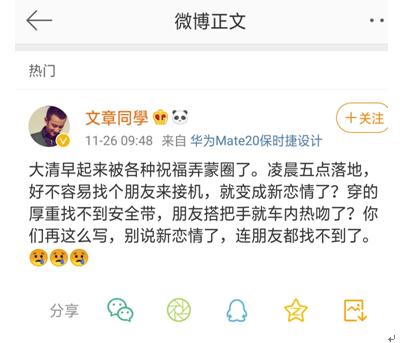 上一秒网友们还在信誓旦旦的说文章的新恋情曝光了,下一秒就被打脸。文章在其社交网络上表示:大清早起来被各种祝福弄蒙圈了。凌晨五点落地,好不容易找个朋友来接机,就变成新恋情了?穿的厚重找不到安全带,朋友搭把手就车内热吻了?你们再这么写,别说新恋情了,连朋友都找不到了。
