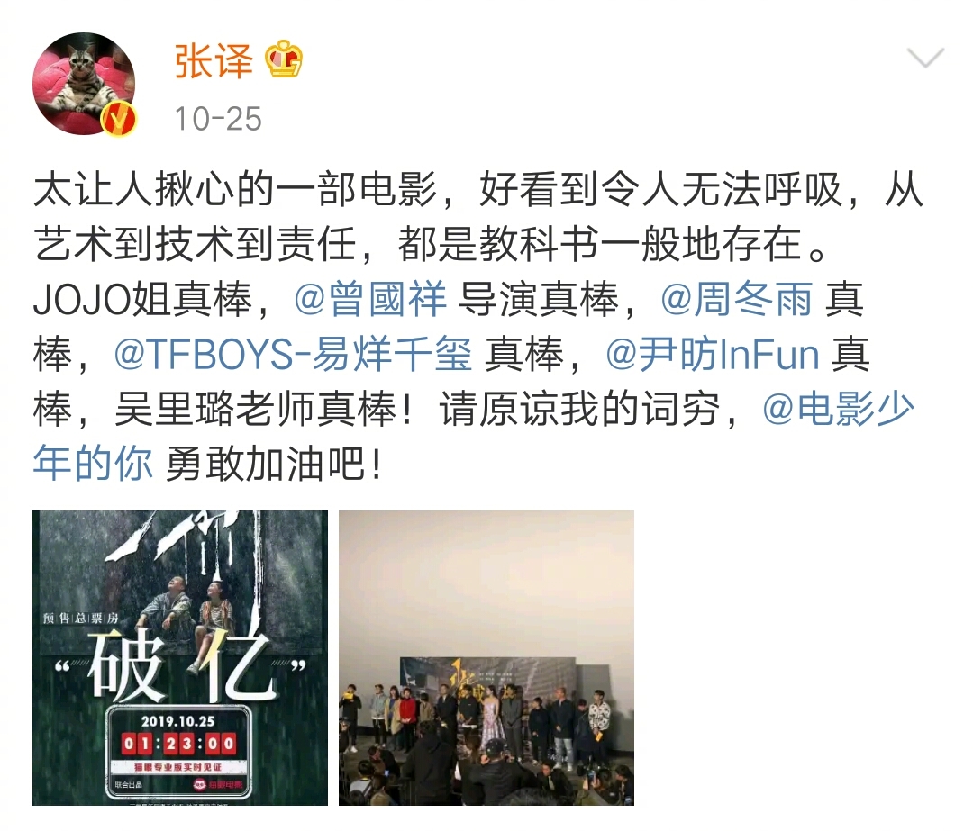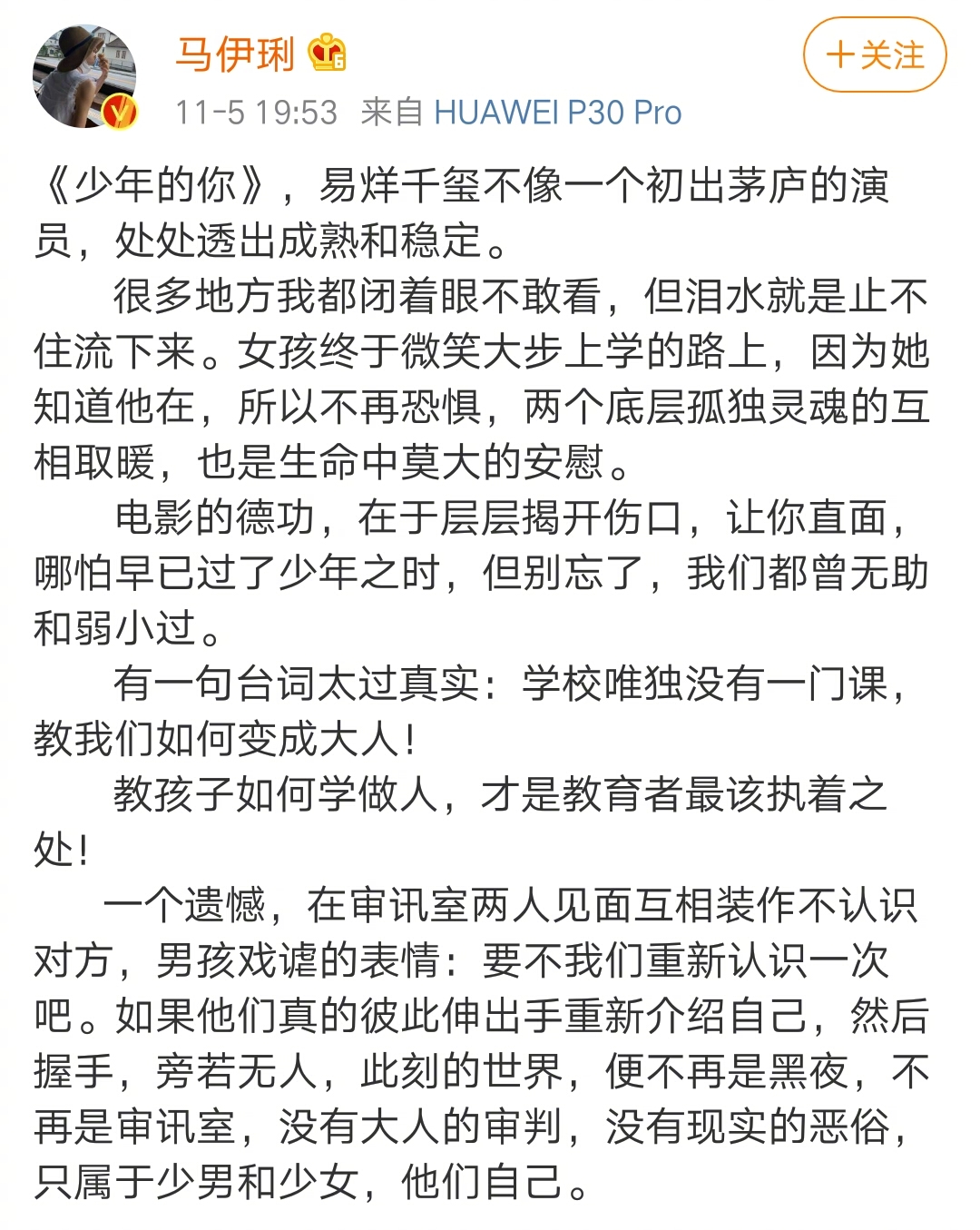 可是,电影上映之后真的是让人刮目相看,几乎是清一色的赞美和夸奖,因为确实好。不仅是粉丝说好,路人和普通观众都说好,电影也好,两位演员都特别好,甚至于其他的配角也很出彩,易烊千玺更是收获了很多人的好评。除此之外,圈中前辈也对他赞赏有加,比如马伊琍,说他不像是一个初出茅庐的演员,处处都是成熟和稳定的。