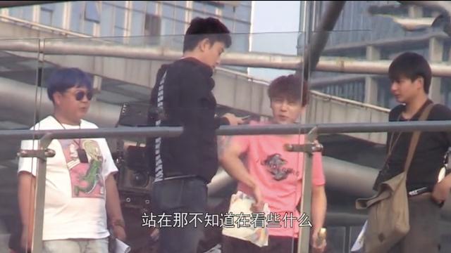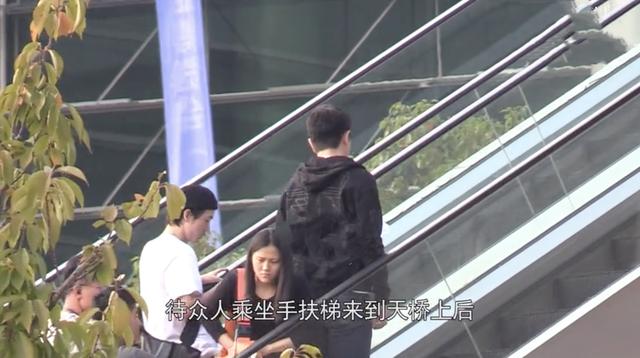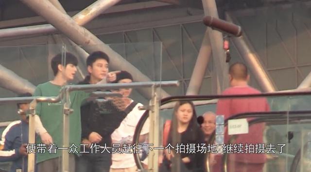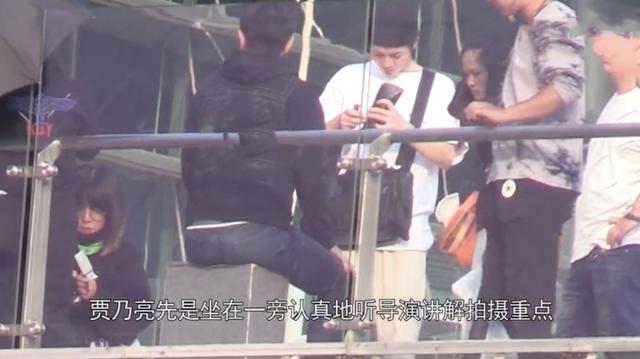 最后一行人通过自动扶梯来到天桥上,随后贾乃亮坐在天桥的椅子上听导演讲戏,随后便一起了和搭档演员聊细节,准备拍摄。整个过程贾乃亮全程不苟言笑,很是严肃。