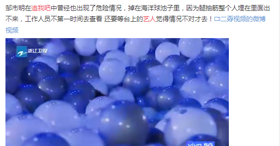 著名拳王邹市明也曾在节目中出现过危险状况,曾掉进海洋球池子,因为腿抽筋整个人被埋在里面出不来,工作人员并没有第一时间去查看,最后是台上艺人发现不对劲了才下去。