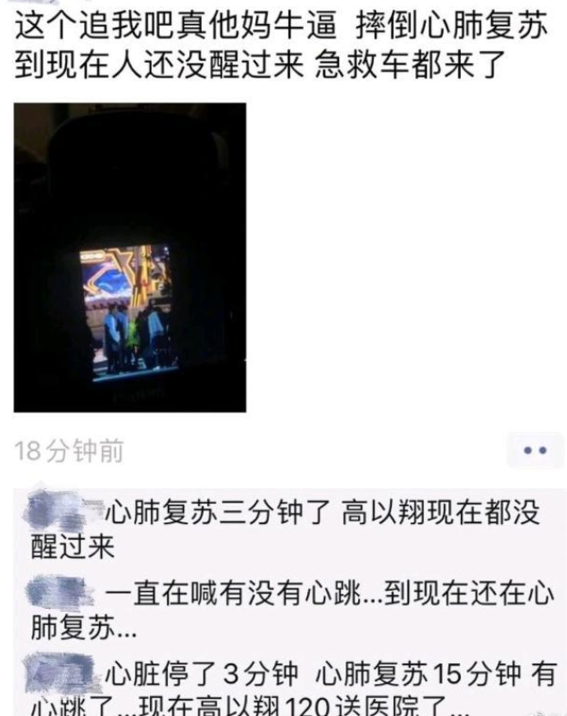 当时还有网友发了朋友圈,但看文字上的记录就觉得惊心动魄,“心脏复苏3分钟了,高以翔现在还没醒!”“心脏停了3分钟,心脏复苏15分钟,有心跳了,现在高以翔120送医院了。”