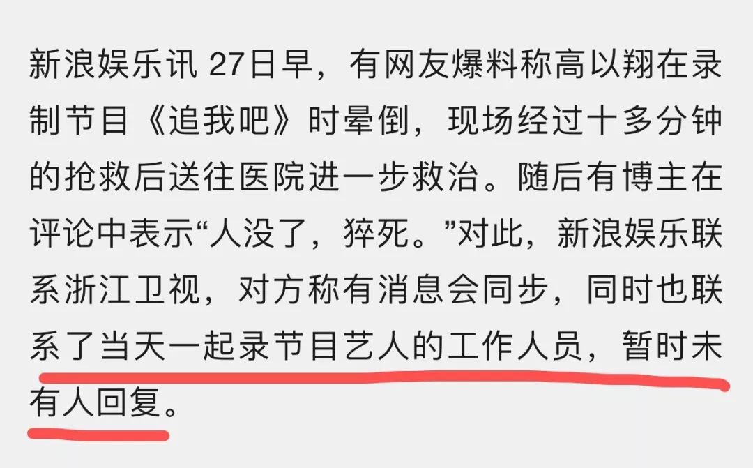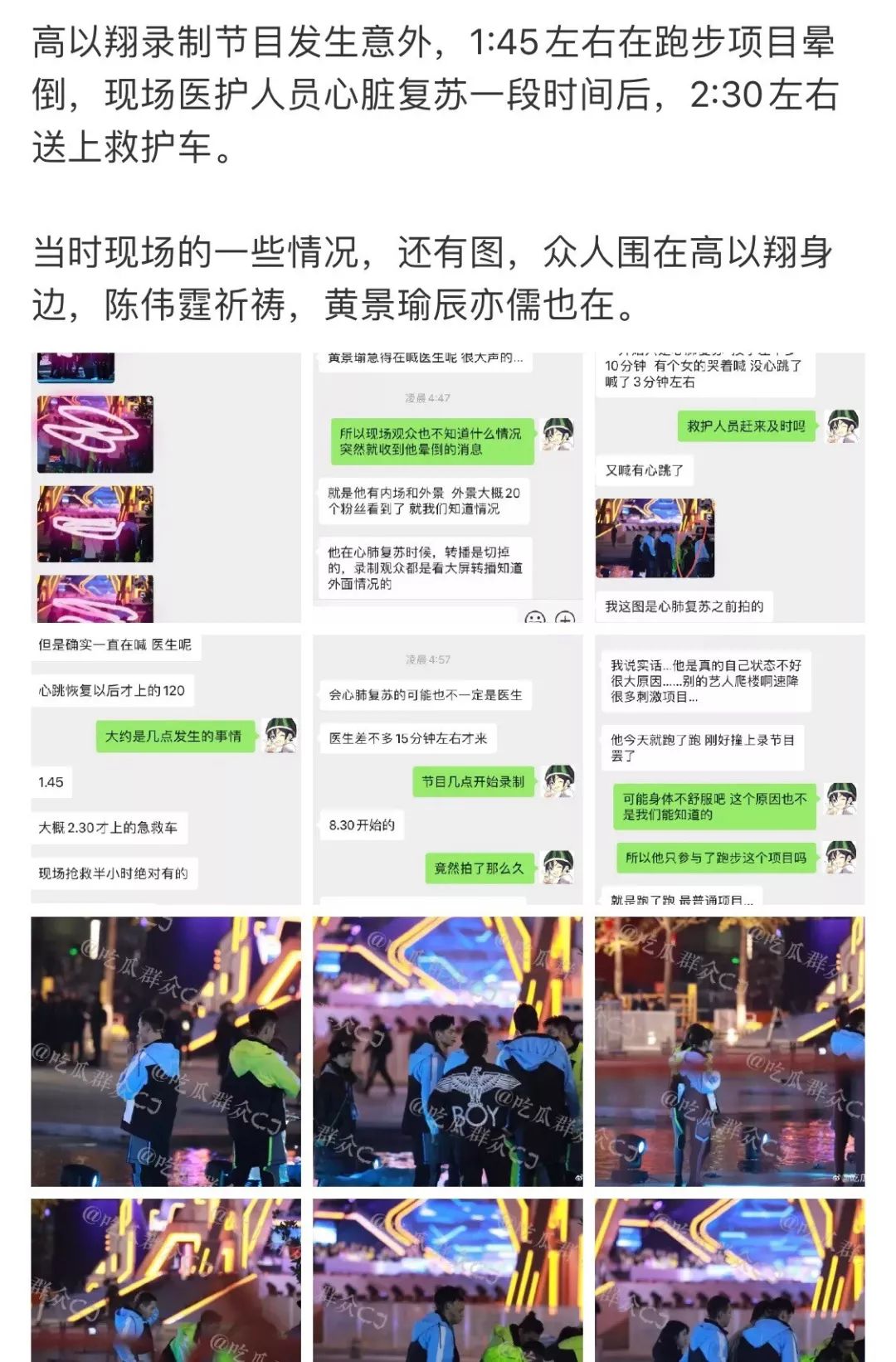 随后又有另外一名知名博主爆料,称高以翔确实经过心肺复苏,但是和前者截然不同的版本是,高以翔休克很久都没有醒过来。该博主还吐槽节目录制接连出现意外,并称范丞丞直接在节目中跑吐了两次,李振宁被救护车扛上去吸氧过。
