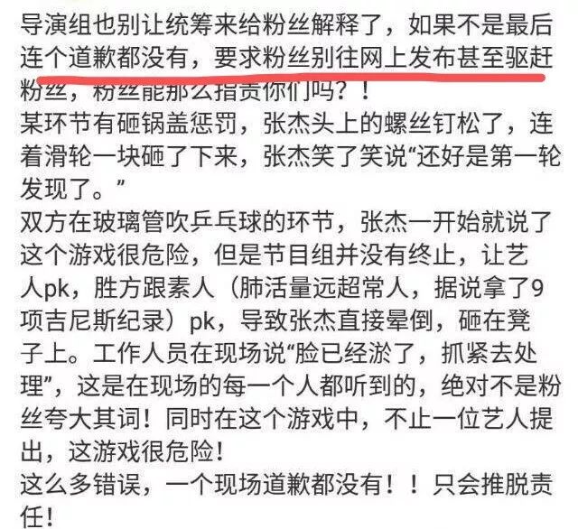 好在当时张杰第一时间出来给大家报平安,大家觉得人没事就好。但是最让粉丝生气的是,节目组让嘉宾意外受伤,不但没有及时作出报道并道歉,还驱赶粉丝的方式让人愤怒又心寒!