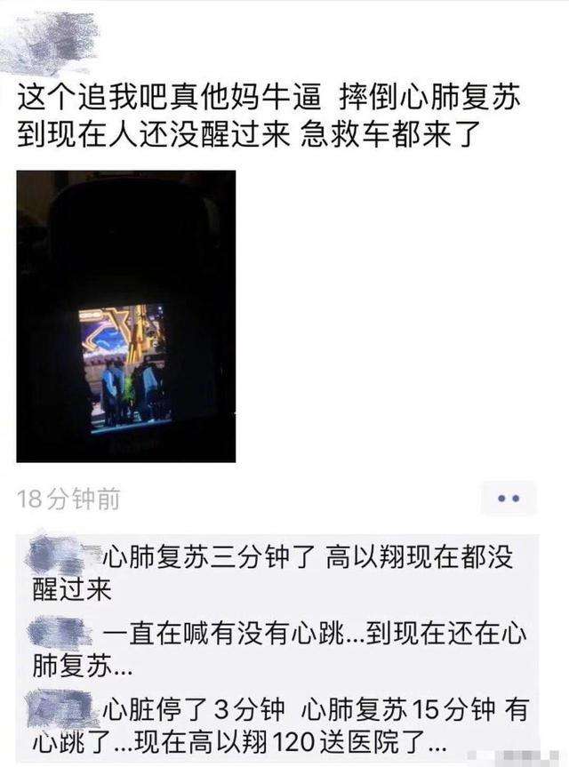 而高以翔晕倒时间,正是在11月27日的凌晨两点多,当时,有现场网友爆料高以翔录制时突然大喊一句“我不行了”随后晕倒,第一时间,高以翔被工作人员判断心脏骤停,随后高以翔被进行心脏复苏,整个现场一直经过十多分钟的抢救后,待到高以翔稍有好转后才送往医院进一步救治。
