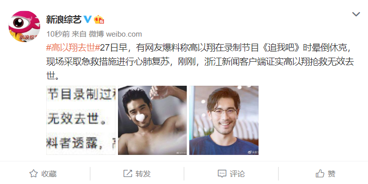在经过近十小时的焦急等待后,日前,浙江新闻已经遗憾宣布,演员高以翔因抢救无效去世,享年35岁。