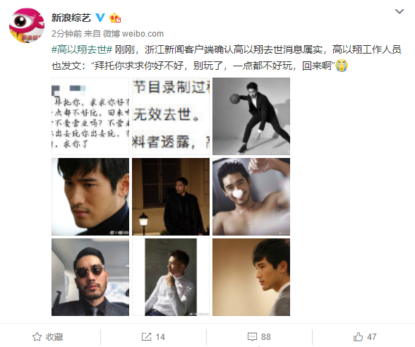 高以翔刚刚被宣布去世,高以翔工作人员也发文:“拜托你求求你好不好,别玩了,一点都不好玩,回来啊”,言词十分伤感,让人心酸。