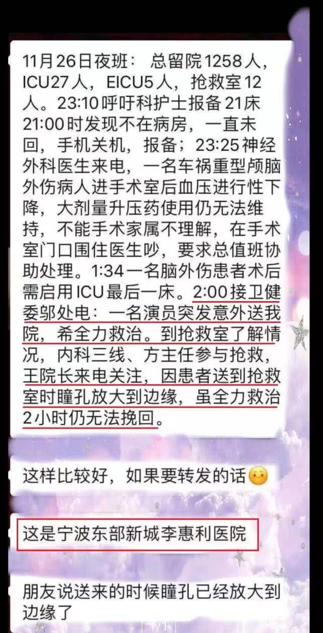 期间还有媒体晒出了在医院的现场图,抢救室前有不少人来回踱步似乎情况依旧不乐观,有不少疑似医院员工的聊天透露出高以翔的“猝死”已经成真,让人不由得担心起了高以翔的状况。