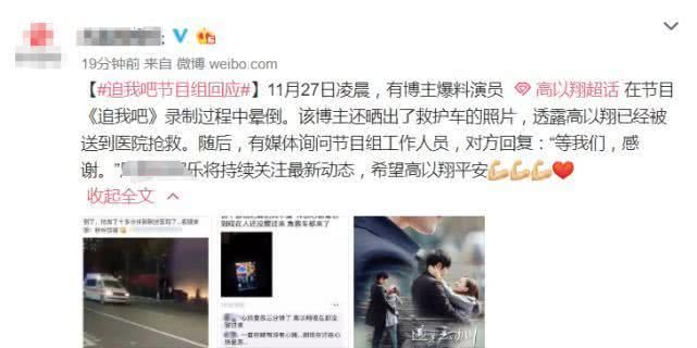 27日凌晨有网友爆料演员高以翔在录制《追我吧》节目时突发意外昏厥倒地,抢救了十分钟甚至心跳都没了3分钟,救护车紧急赶往现场,更有博主爆料“人没了”疑指高云翔已经离世,而节目组至今只是给了一句:“等我们,感谢。”并未透露高以翔的近况显得疑点重重。