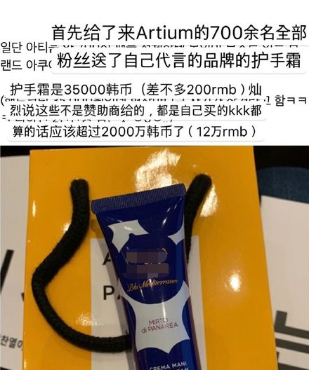 第一的小礼物是灿烈自己掏腰包,为爱丽们准备了自己代言的品牌的护手霜。冬天来了,正是好好保护手的时候,拿到灿烈送的护手霜的爱丽,每一次用护手霜的时候是不是都觉得像是在恋爱呢?不!我拿到这个护手霜应该会舍不得用吧!护手霜准备了700份,份额很大了,灿烈差不多花费了超过两千万韩币。