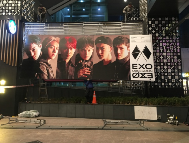 11月27日终于来了,这次是六人的形式的回归,也是EXO有史以来回归人数最少的一次。虽然人数是最少的一次,但是爱丽的热情却没有少。回归的真实感越来越强,11月26日的SMtown不光沉浸在灿烈生日会的喜悦中,SMtown的工作人员还在夜晚中挂上了EXO六专的巨幅海报。