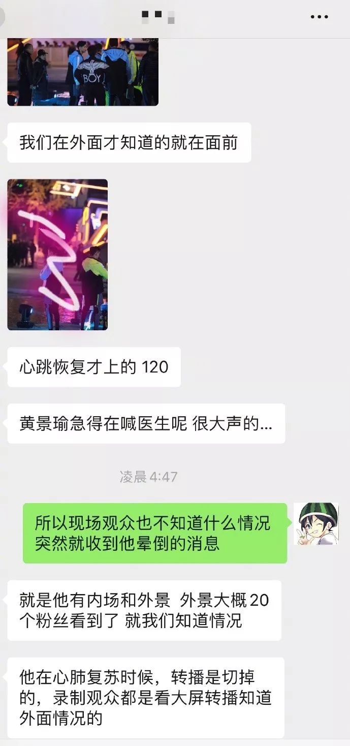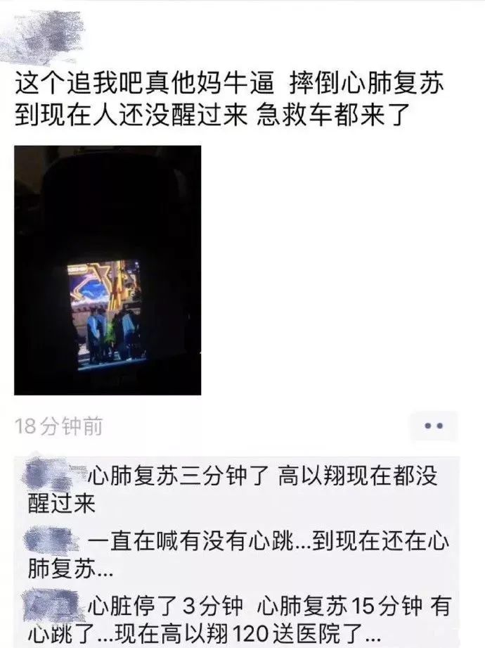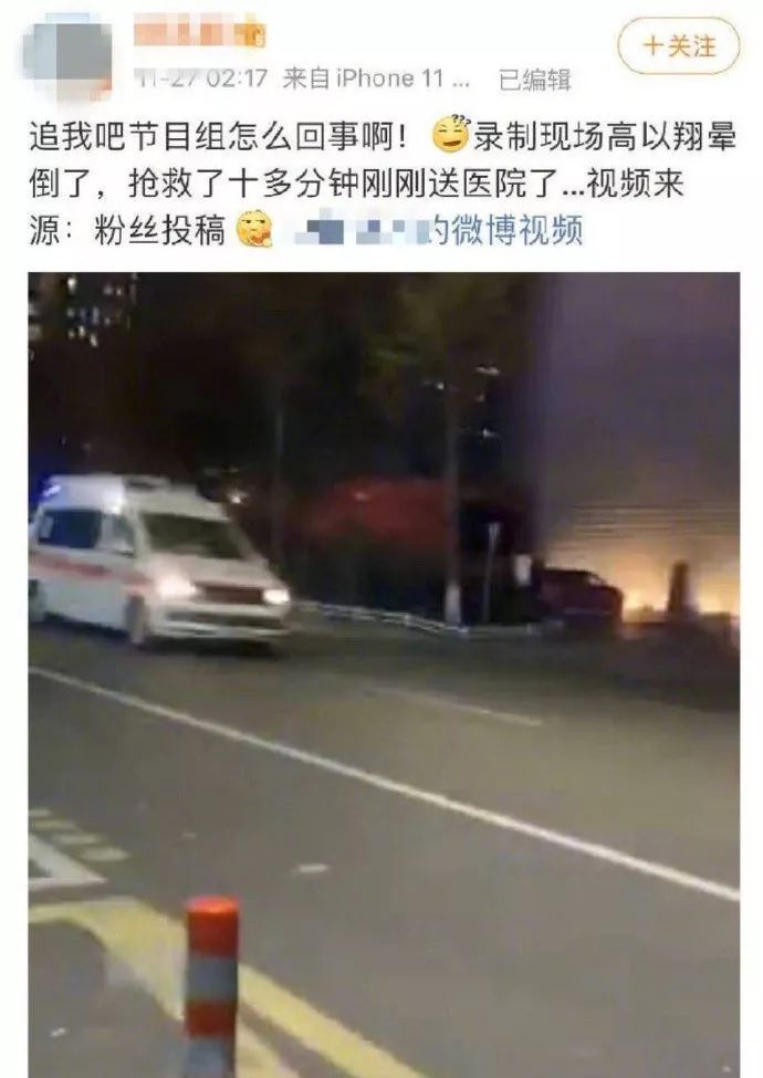 今天演员高以翔在录制《追我吧》晕倒抢救,有网友曝光现场图,并表示黄景瑜急切的寻找医生,陈伟霆双手合十祈祷,黄景瑜辰亦儒等也在旁边,神情关切。该博主还晒出了救护车的照片