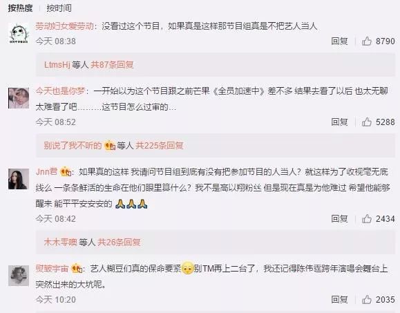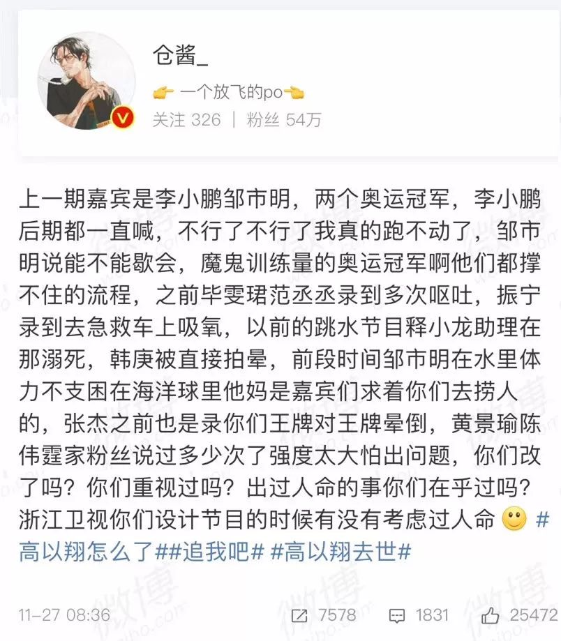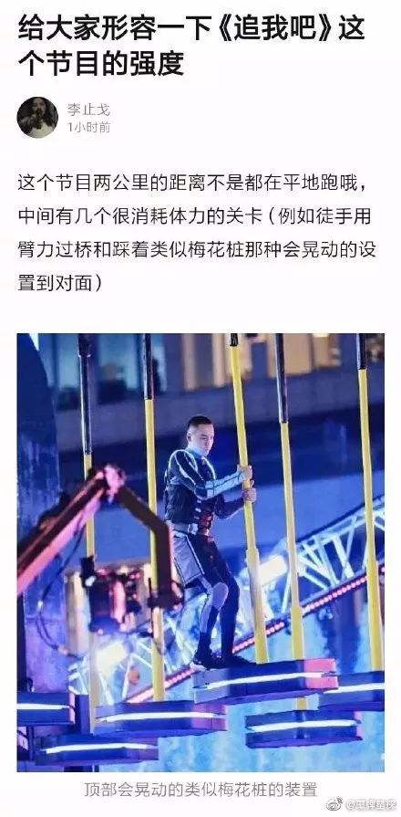 据悉,高以翔录制该节目非常疲劳,从26号早上8:30一直录到出事的27号凌晨1:30左右,连续工作时长高达17小时。这个强度别说是明星,放任何人身上可能也吃不消。有大V爆料:上一期嘉宾是李小鹏邹市明,两个奥运冠军,李小鹏后期都一直喊,不行了不行了我真的跑不动了,邹市明说能不能歇会,魔鬼训练量的奥运冠军啊他们都撑不住的流程,之前毕雯珺范丞丞录到多次呕吐,李振宁录到去急救车上吸氧,以前的跳水节目释小龙助理在那溺死,韩庚被直接拍晕。前段时间邹市明在水里体力不支困在海洋球里是嘉宾们求着你们去捞人的,黄景瑜陈伟霆家粉丝说过多少次了强度太大怕出问题,你们改了吗?你们重视过吗?出过人命的事你们在乎过吗?《追我吧》节目难度和强度也上了热搜榜首,很多大V都感觉对该节目的强度有很大争议: