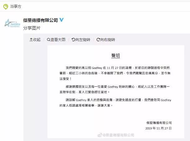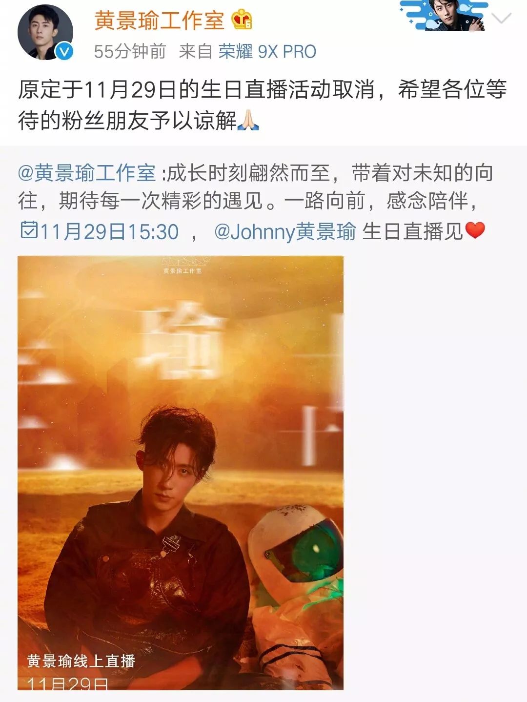 事发后,现场亲历这一幕的黄景瑜也许是难掩心中的悲痛,已经取消了原定11月29日举行的生日直播。我们也表示理解,毕竟其实演艺圈的朋友是很团结的,更何况一起录制节目的兄弟出事。