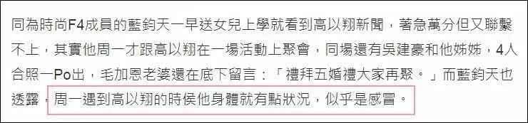 不过据高以翔的好友蓝钧天透露,周一那天高以翔的身体就有点状况,貌似是感冒了。