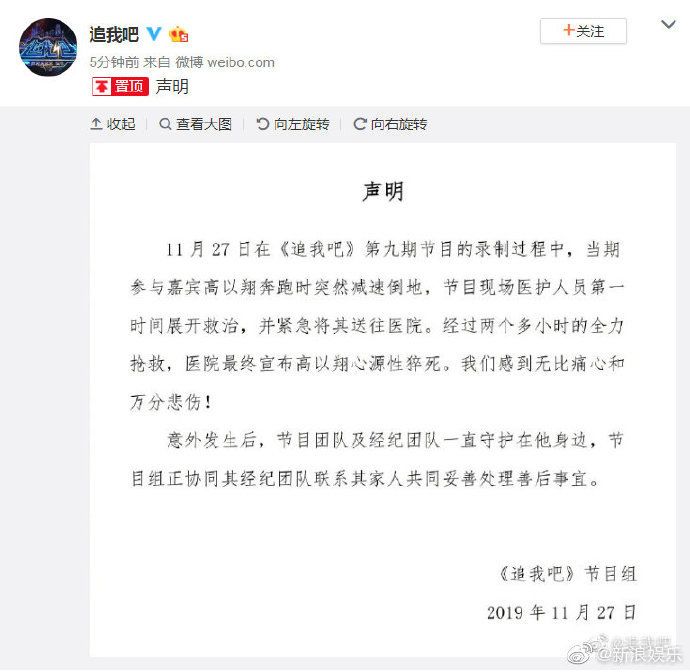 终于《追我吧》节目组也发布了声明很快今天上午高以翔去世的消息上了热搜