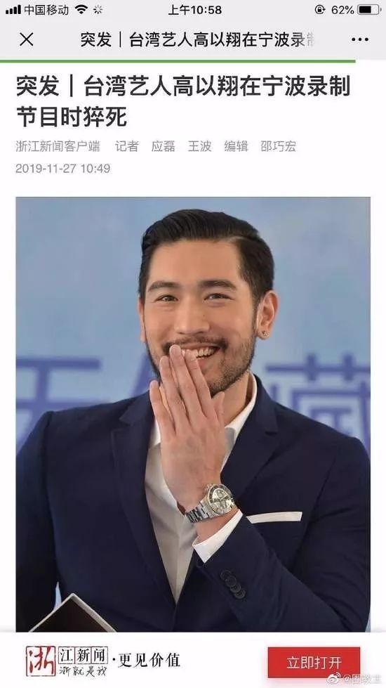 早上10点,媒体报道,台湾演员高以翔已证实因抢救无效去世,享年35岁。