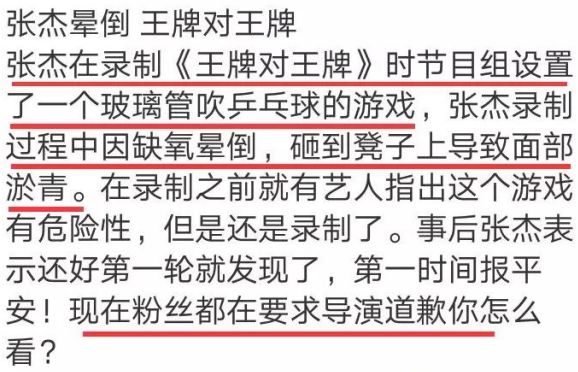 当时的游戏环节是全员1对1用玻璃管吹乒乓球的游戏,但张杰在参与中途因缺氧而晕倒,还砸到凳子上导致面部淤青。