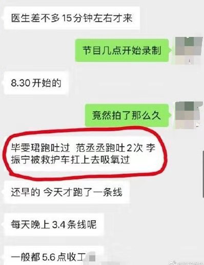 高强度的运动,加上深夜的录制行程,据某大V爆料很多艺人都曾经出现过身体不适的状态,毕雯珺、范丞丞都跑吐过,黄旭熙曾因雨天路滑而摔跤,李振宁还被抬上救护车去吸氧,而高以翔似乎前几天还有一场小小的感冒。