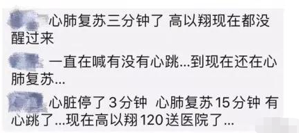 据知情网友爆料,高以翔一晕倒,现场就有人喊“没有心跳了”,虽然医护人员对高以翔进行了十多分钟的心脏复苏,但高以翔并未转醒。