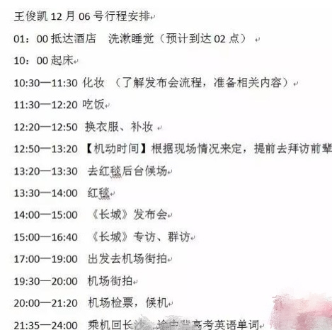 在早些的2016年,有一张疑似王俊凯的一日行程单曝光。