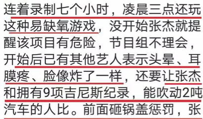 那个时候,就有网友分析了当时的状况:艺人连续录制了7个小时,凌晨三点还进行易缺氧游戏,这些都是令张杰晕倒的原因。